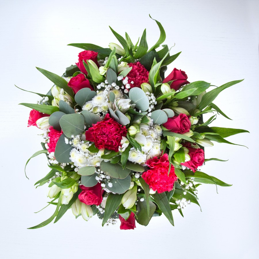 Immerse yourself in a world of refined beauty with our Timeless Elegance Bouquet, an arrangement of fresh, hand-selected blooms designed to captivate and inspire. This bouquet showcases beautiful white chrysanthemums, soft gypsophila, luscious red roses, charming carnations, elegant white alstroemeria, and graceful aspidistra leaves. Each flower has been selected to meet the highest standards of quality and longevity.