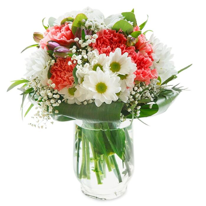 Embrace the sophisticated elegance of our stunning flower arrangement. Featuring a tasteful combination of snow-white chrysanthemums, ethereal gypsophila, and rosy light pink carnations, complemented by rich aspidistra leaves.